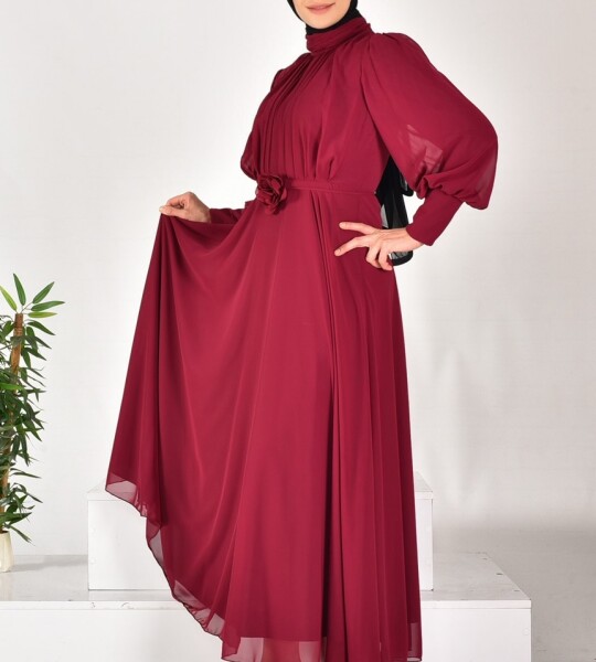 1314 DOUBLE KUMAŞ ETEĞİ PİLİSE DETAYLI KRUVAZE YAKA TESETTÜR ELBİSE-BORDO