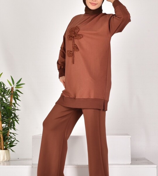 10593 PUANE İKİ İPLİK KUMAŞ TAŞ BASKILI SWEATSHIRT-KAHVE