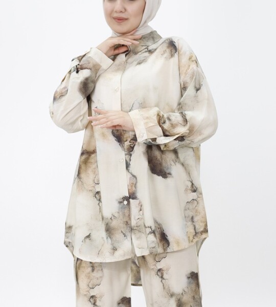 24182 PAMUKLU SATEN KUMAŞ DESENLİ İKİLİ TAKIM-BEJ