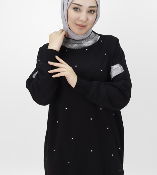 10457 PUANE İKİ İPLİK KUMAŞ SİM DETAYLI VE TAŞLI SWEATSHIRT-SİYAH