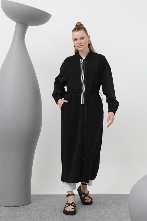 Tasarım: Tesettür giyime uygun, uzun ve bol kesim tasarımı vücut hatlarını zarif bir şekilde örter. Şık bir kapüşon veya yaka tasarımıyla da tamamlanmış olabilir. Her bedene uyum sağlayacak şekilde tasarlanmıştır.