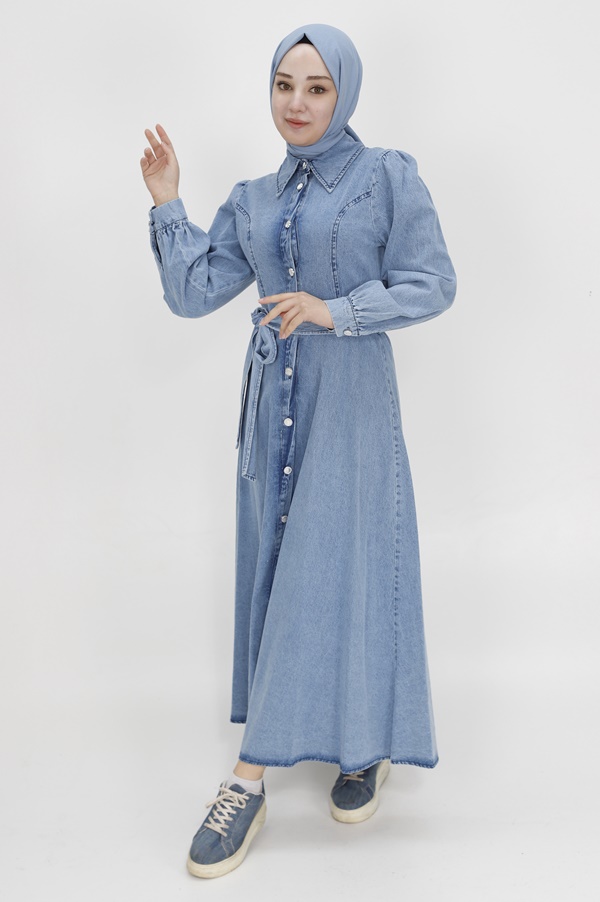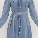 1547 Gömlek Yaka Düğmeli ve Kemerli Uzun Kot Elbise-BUZ MAVİ için 0 inceleme