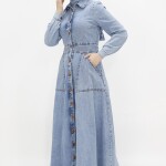 Zarif ve fonksiyonel: Bu tesettür uzun kot elbise, şık gömlek yakası ve kullanışlı cepleriyle öne çıkıyor.