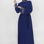 4431 Krep Kumaş Yakası ve Bileği Taş Detaylı Kemerli Tesettür Abiye-LACİVERT için 0 inceleme